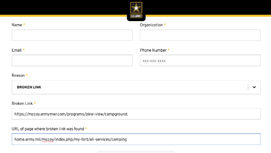 In this example the broken url is from home.army.mil/mccoy They encourage content updates and link requests. Simply contact army.mil/contact and request the fix.