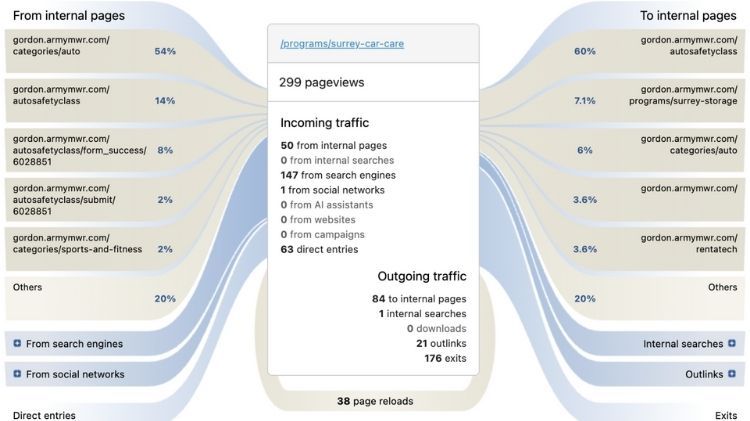 - Other internal destinations account for much smaller shares of traffic, indicating a strong, intentional user path